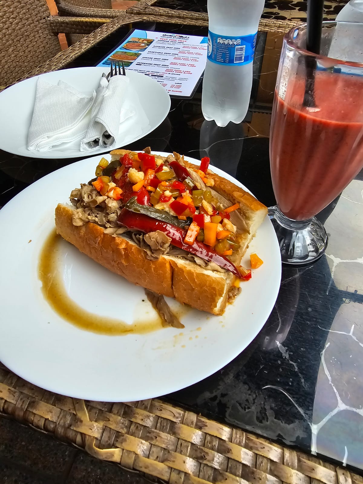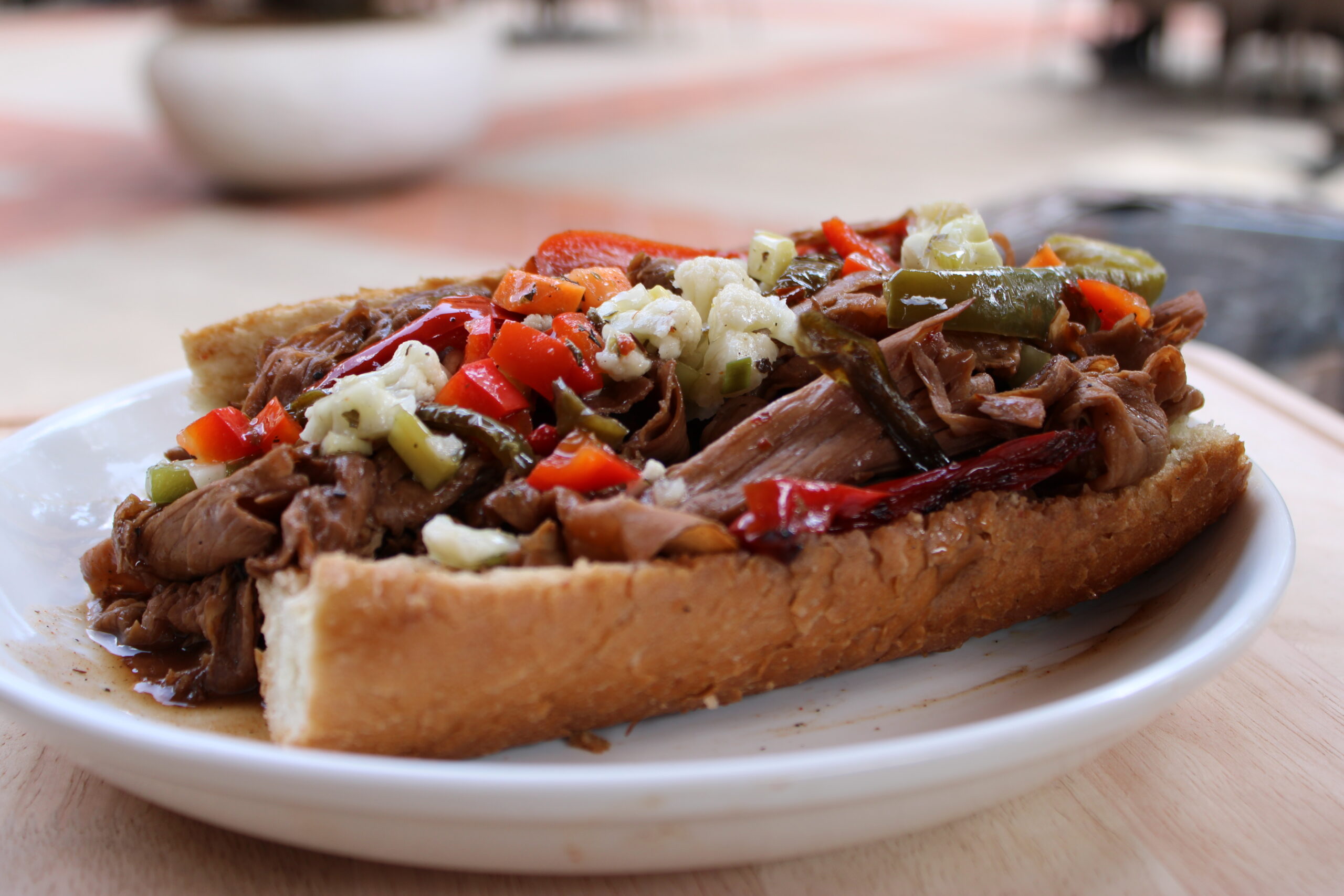 Delicious thinly sliced beef in gravy/sauce with giardiniera (pickled vegetables) & peppers (hoho)