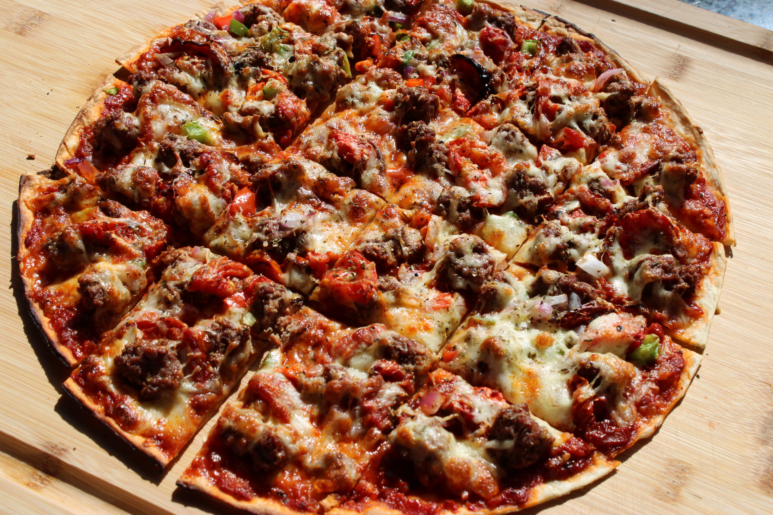Chicago Tavern Style Thin Crust Pizza with Homemade Beef Sausage, Cheese, & Our Delicious Pizza Sauce